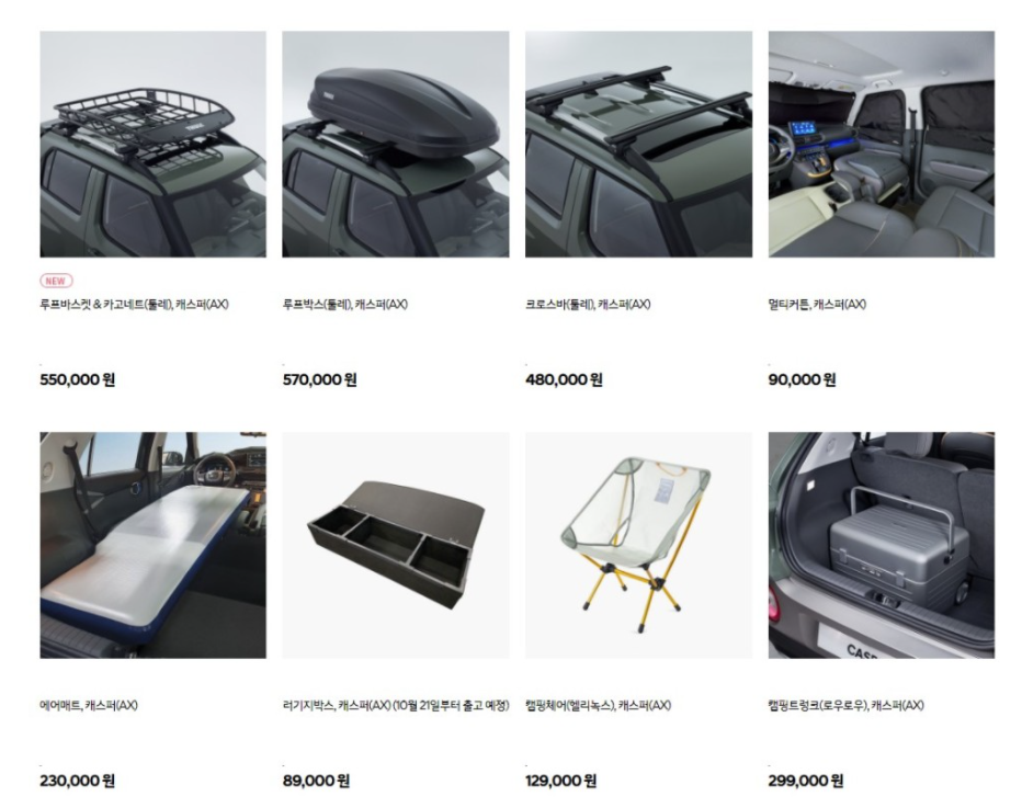 하여 브랜드 제품을 커스터마이징하여 판매하기도 한다. H Genuine Accessories를 통해 관람 할 수 있는데 펫 프랜들리, 여행의 정석, 공간 활용 기술 등의 다양한 테마로 전용 제품을 공급하고 있다. 고객들은 특히나 캠핑카나 차박용으로 현대 캐스퍼를 고려하는데 정석과 공간활용의 기술테마에서 필수 용품들을 볼 수 있다.
