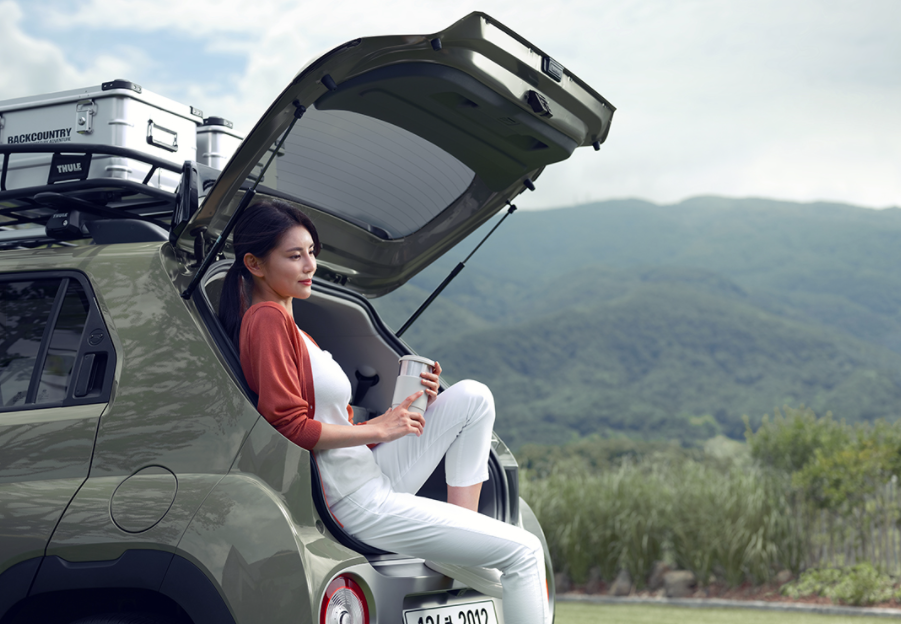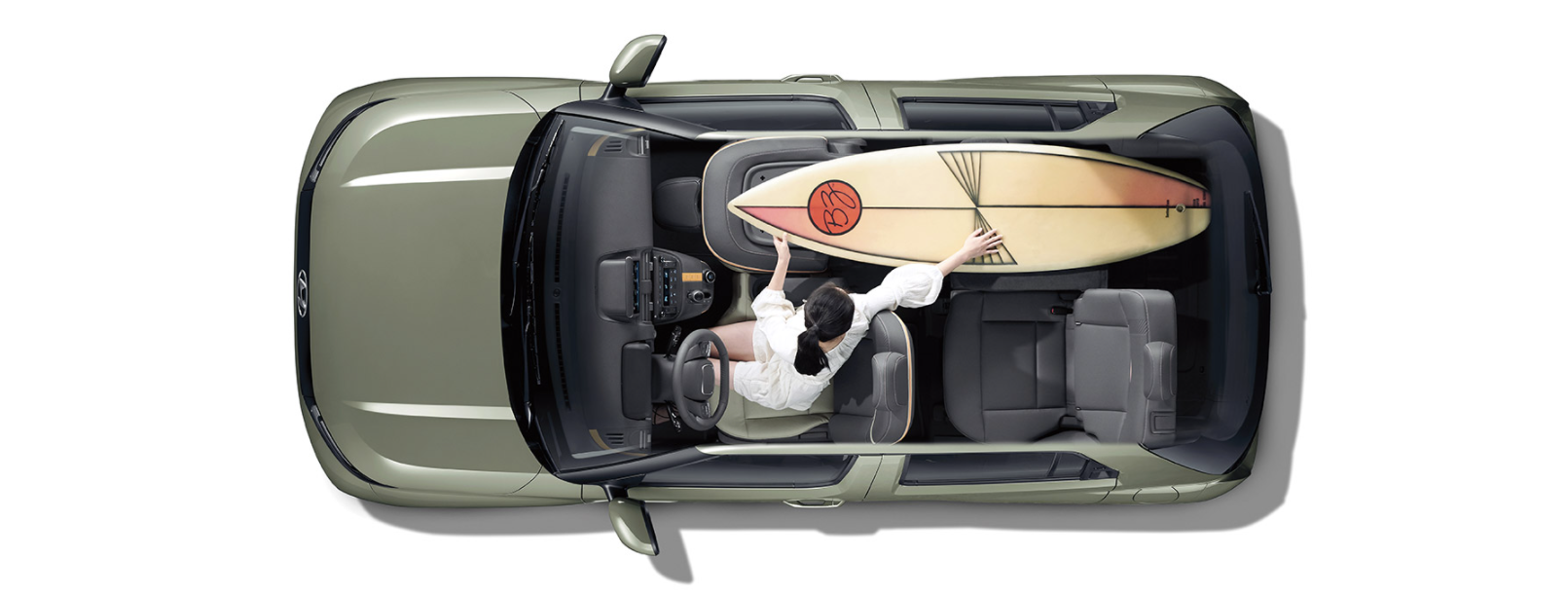 1열에는 어느 차량에도 시도가 되지 않았던 풀폴딩 기능은 현재 트랜드인 차박과 캠핑에 최적화이다. 평면으로 완전히 접혀지면서 트렁크에서부터 일열로 패드를 깔아 누울 수도 있고 서핑보드 또한 조수석에 들어갈 수 있는 사이즈이다. 물론 현대 캐스퍼의 1열을 접으려면 머리 받침대 부분도 뽑아야하는 불편함이 있기는 하지만 경차가 할 수 있는 최대한의 공간 창출 효과를 누릴 수 있다는 것이 큰 장점이다.